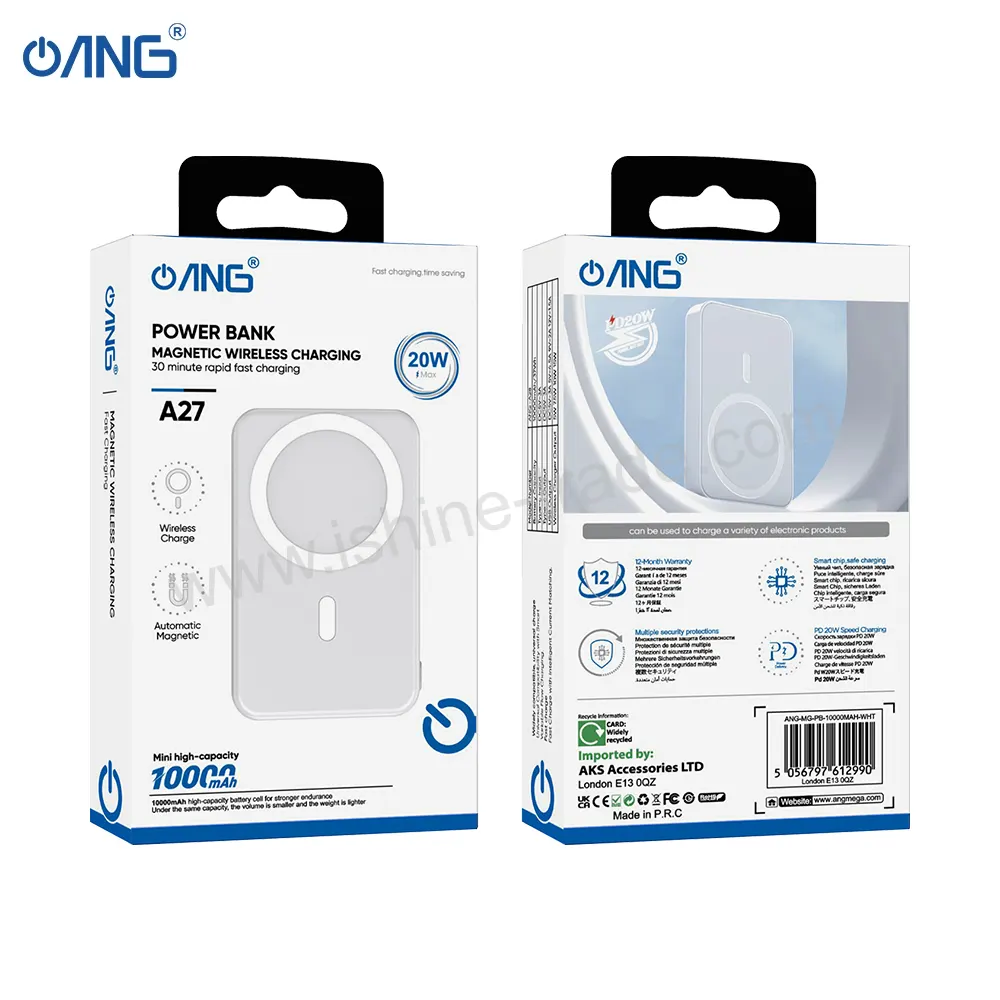 Designed for convenience and performance, it features intelligent magnetic alignment for seamless wireless charging, plus multiple output options including USB and Type C. With up to 20W fast charging and multiple power outputs (including 5W, 7.5W, 10W, and 15W wireless charging), the ANG A27 adapts to your device’s needs for optimal charging speed.