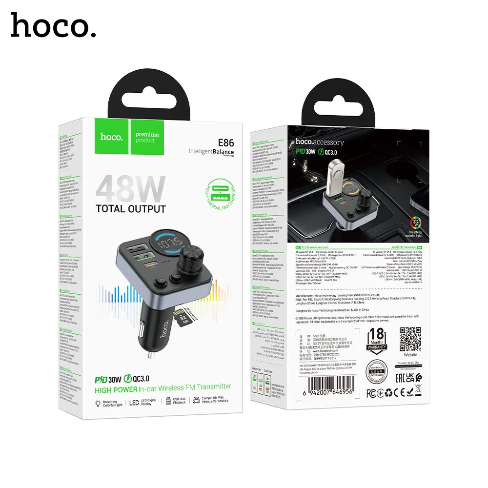 Hoco E86 Alegria 48W Dual Port PD 30W and QC 3.0 Car Bluetooth FM Transmitter