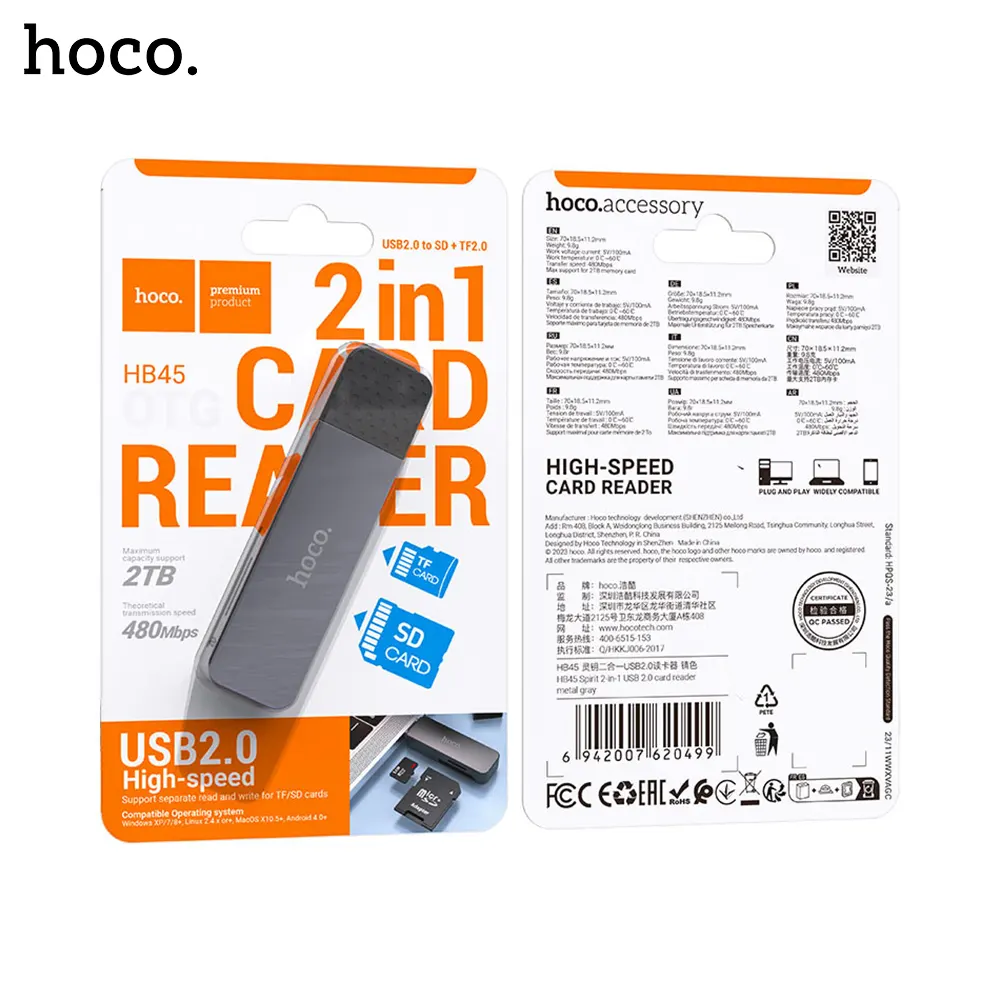 - 1 × HOCO HB45 Spirit USB A To SD and TF 2.0 Card Reader